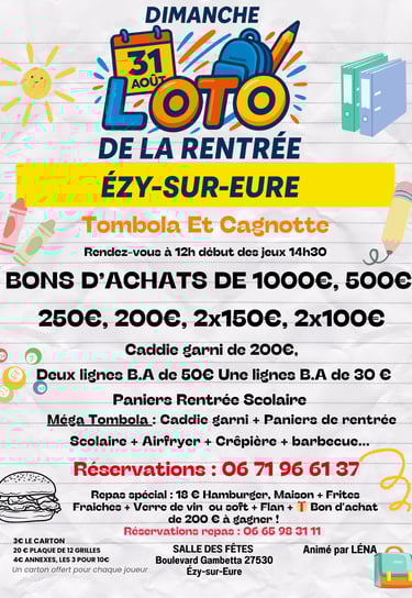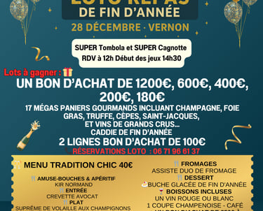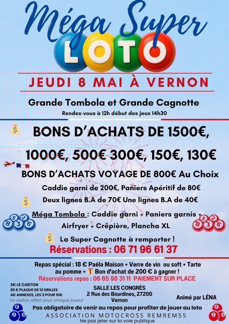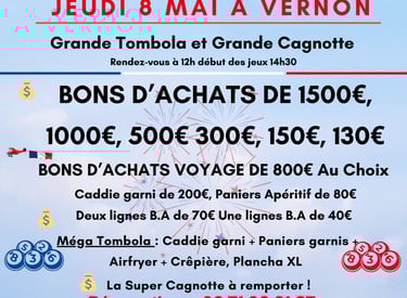 Le Jeudi 8 mai, rejoignez-nous pour le Méga Super Loto à Vernon ! Tentez de gagner des bons d'achat, un caddie garni, des paniers apéritif, et plus encore. Ne ratez pas la Méga Tombola et la Super Cagnotte !