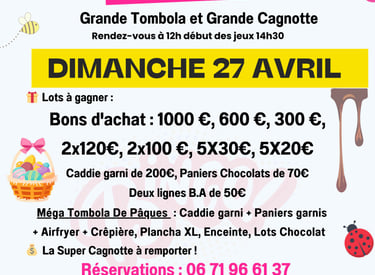 Le Dimanche 27 Avril , rejoignez-nous pour le Méga Super Loto de Pâques à Vernon ! Tentez de gagner des bons d'achat, un caddie garni, des chocolats géant, et plus encore. Ne ratez pas la Méga Tombola et la Super Cagnotte !