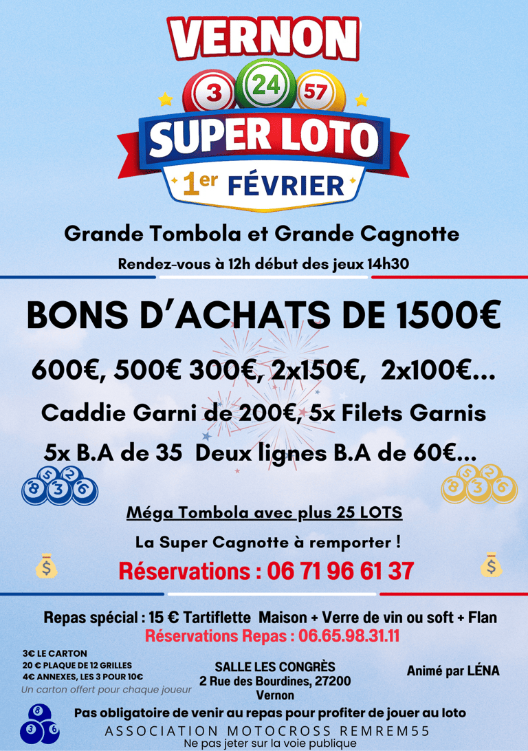 L’Association Motocross Remrem55 vous donne rendez-vous pour un Super Loto à Vernon !
