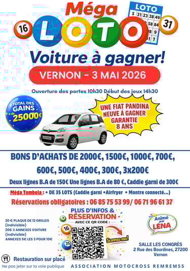 L’Association Motocross Remrem55 organise un MÉGA LOTO exceptionnel à Vernon avec une FIAT PANDINA neuve à gagner 🚗, garantie 8 ans, plus de 25 000 € de lots, de nombreux bons d’achats, une méga tombola et une super cagnotte finale !